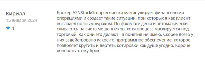 Обзор ASN Stock Group четко показывает, что контору стоит внести в черный список, поскольку она занимается обманом. Таких контор с каждым днем становится все больше и, работать с ними нельзя, да бы не попасться на обман. Мошенники в сети создают подобные брокерские лохотроны пачками, соответственно стоит быть осторожнее, не попадаясь на такие конторы, ведь сотрудничество с ними закончится провалом.