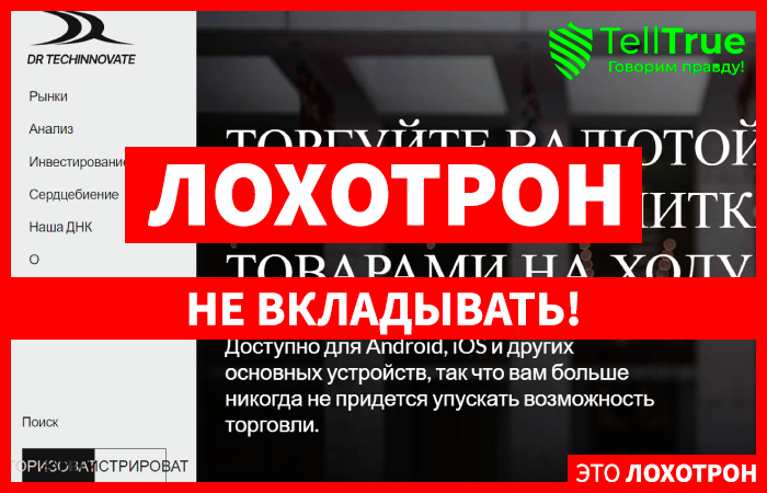 Примером брокерской мошеннической организации, запущенной с целью обмана людей и развода их на деньги через липовый терминал является площадка для DR Techinnovate. Этот сайт пытаются выдавать за престижную брокерскую организацию, сотрудничающую с клиентами на прозрачных условиях. На самом деле, от прозрачности на данной площадке нет и следа.