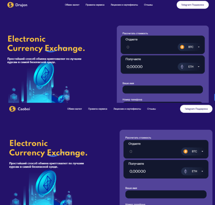Drujon – это пример шаблонного и примитивного обменника, который был создан для обмана обычных людей. Данная организация появилась пару дней назад, но ее уже рекламируют, как надежную и проверенную. Этот шаблонный проект продвигается мошенниками в Телеграмме. И так, они обманывают обычных людей.