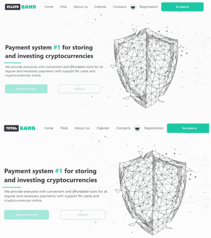 Примером шаблонного банка мошенников, созданного с целью обмана простых людей, является проект Eclips Bank. Аферисты пытаются рассказывать доверчивым людям, что их банк официально работает с 2001 года, но эта информация не является правдивой. Сайт запустили несколько дней назад, а шаблонных собратьев у него настолько много, что сразу можно понять – это обман.