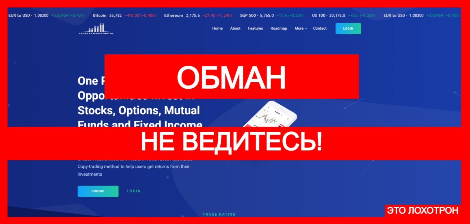 Они заявляют, что всего за несколько дней любой желающий сможет освоить рынок и начать стабильно зарабатывать. Отличная перспектива? Разве что на бумаге. На деле это очередной развод для наивных пользователей, не знакомых с реальной работой финансового рынка. Начнем с главного – с сайта. Именно он чаще всего первым попадается на глаза потенциальным жертвам, и именно на нем можно увидеть все признаки мошенничества. Адрес аферы – legacychaincapital.com. Что мы видим? Обычный шаблон, который можно встретить у сотен других сомнительных проектов.