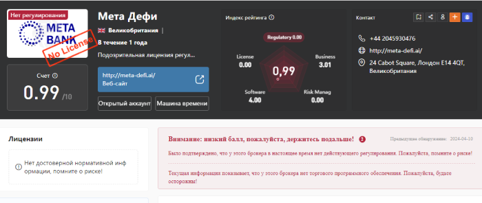 Одной из основных проблем с Meta Defi является то, что компания не обладает необходимыми лицензиями для оказания финансовых услуг. Это означает, что брокер не регулируется соответствующими органами и не несет ответственности перед клиентами за свои действия. Такие брокеры обычно становятся объектами мошенничества и часто исчезают, не выполнив свои обязательства перед клиентами.