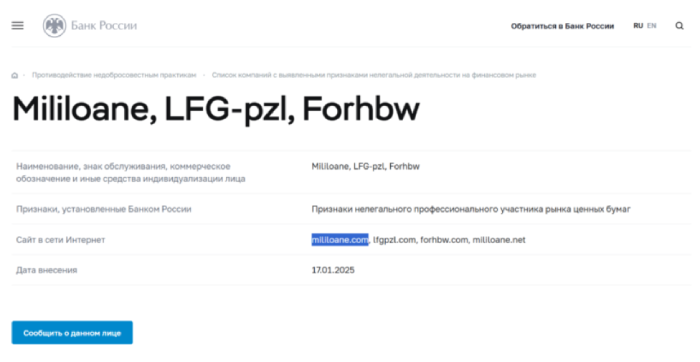Примером брокерской организации, что была создана серийными мошенниками для выманивания финансов, является Mililoane. Этот лохотрон был создан жуликами для того, чтобы грабить население. Сейчас статистика на сайте, как и его контакты и лицензирование не являются реальными. Мошенники просто создали красивую картинку для того, чтобы грабить и обманывать обычных людей.