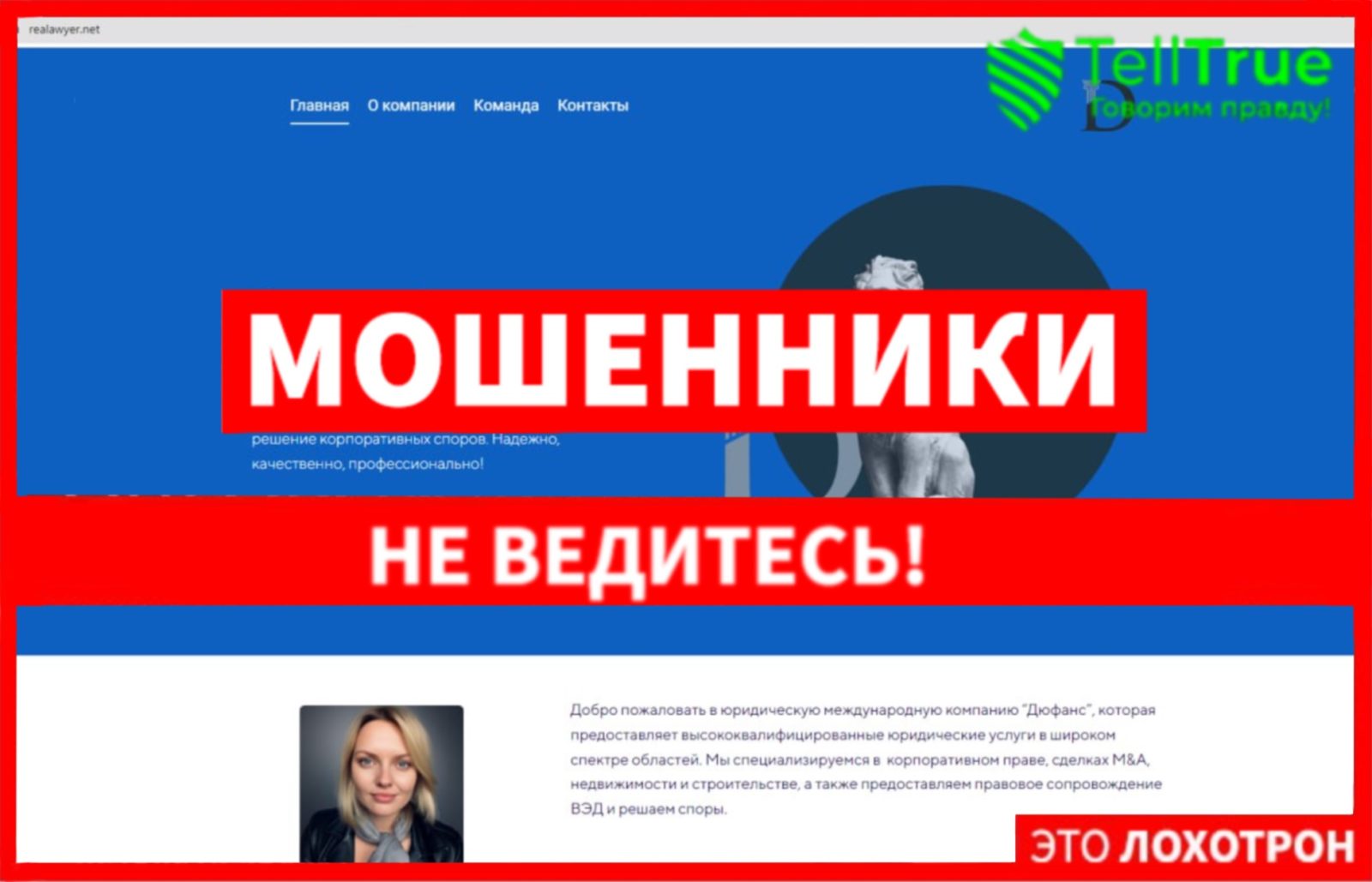 Примером проекта жуликов, выданного за реально существующую юридическую компанию с целью наглого грабежа, является контора Юридическая Компания “Дюфанс”. На сайте пишут, что в сфере юридических услуг проект работает более семи лет и, реально в реестрах есть фирма с такими реквизитами, зарегистрированная в 2016 году, вот только к нашим героям она отношения не имеет.